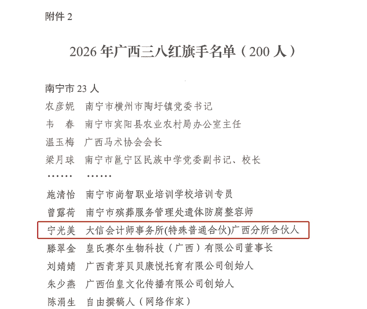 在第116个“三八”国际妇女节即将来临之际,广西壮族自治区妇女联合会发布《关于表彰2026年广西三八红旗手标兵、广西三八红旗手、广西三八红旗集体的决定》,并举行了相关纪念表彰活动,大信广西分所合伙人宁光美成功获评2026年广西三八红旗手。